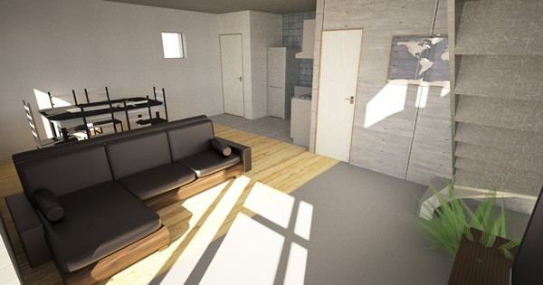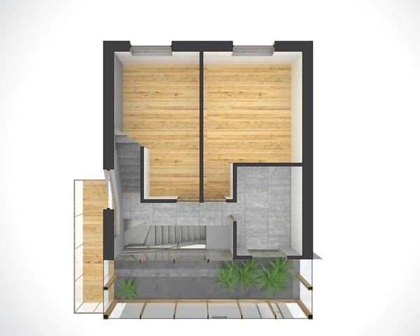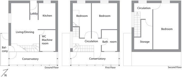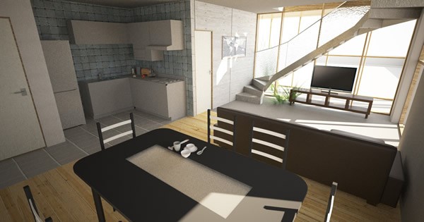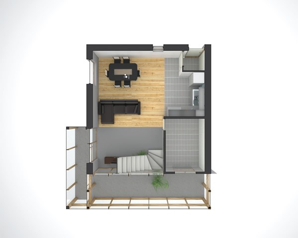On the ground floor, in order to increase dining/living space, the entrance lobby and kitchen space were redesigned. In the new layout, the main entrance was moved to the North East corner, the kitchen was made without any partition and it was put next to the machine room. As a result, the new ground floor planning has significantly larger dining/living area, yet same size kitchen as in the second design option.